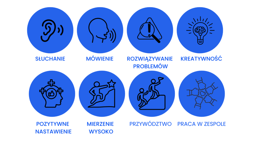- 7. Przywództwo – umiejętność wspierania i zachęcania innych do wspólnego osiągania celów;